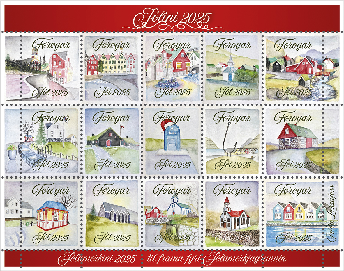 Nýggj jólamerki verða sniðgivin hvørt ár, og í ár hevur Fríða Laksáfoss sniðgivið jólamerkini, sum mynda bý- og bygarmyndir í Føroyum. Eitt ark við 15 merkjum kostar 30 krónur, og ársins jólamerki fáast til keyps á Posta og á stamps.fo frá 20. oktober, skrivar Posta.
