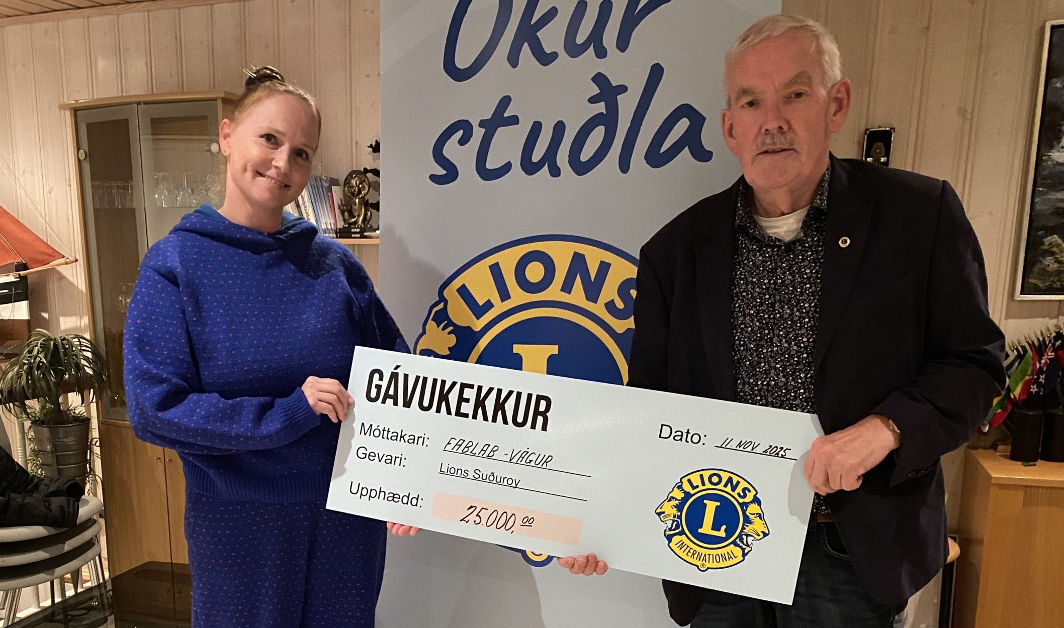 Tina Grønbech, leiðari á Fab-Lab í Vági tekur ímóti kekkinum frá Bent Albinus, forseta í Lions Suðuroy til sermerktu og slóðbrótandi verkætlanina, tey eru farin undir