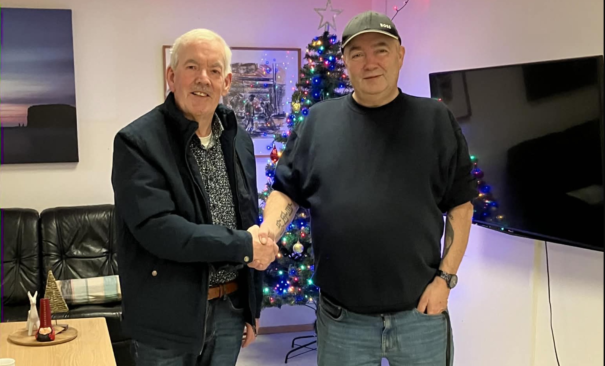 Martin Kúrberg, leiðari á Herberginum, høgrumegin, takkar Bent Albinus, forseta í Lions Suðuroy, fyri gávuna