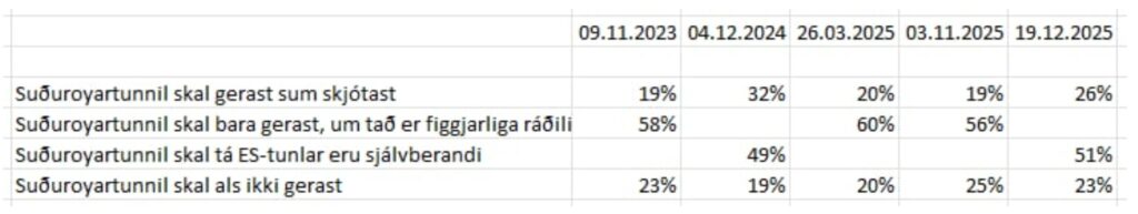 19. desember lat Kringvarp Føroya gera veljarakanning, sum Spyr.fo, hevur gjørt. Ein av spurningunum í kanningini er um Suðuroyartunnilin – og um Suðuroyartunnilin skal koma ella ikki.