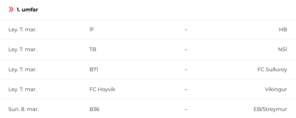 Fyrsta umfar hjá 1. deild er leygardagin 7. mars. TB byrjar á heimavølli, meðan FC Suðuroy spælir úti.