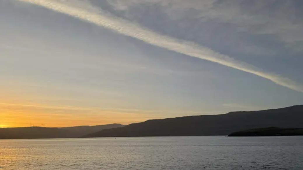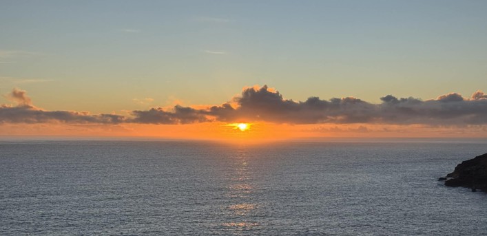 Sólin reis úr havi í morgun klokkan 09.31 í næstan beinum landsynningi (138°). Tá ið hon fór í kav seinnapartin klokkan 15.41 var tað í næstan beinan útsynning (223°). Vit siga, at Sólin rísur í eystri og setur vestri, men tað er bert heilt satt, tá ið tað er várjavndøgur og heystjavndøgur. Lærari í astronomiskari siglingarlæru plagdi at siga, at “…i østen stiger solen op, passar bara tvær ferðir um árið”. Mynd: Jari í Hjøllum.