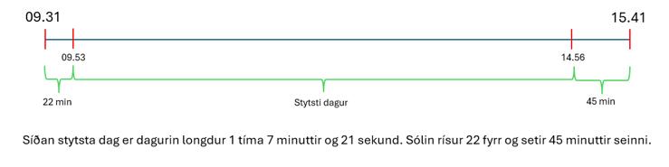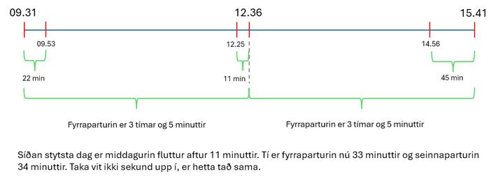 Hesin tími saman við nøkrum minuttum og sekundum er ikki býttur javnt í tvey og lagdur afturat á morgni og kvøldi. Sólin fór í morgun upp 22 minuttir fyrr enn á stytsta degi og fór niður 45 minuttir seinni enn stytsta dag. Við øðrum orðum eru meiri enn tveir triðingar av økingini av degnum seint seinnapartin og bert ein lítil triðingur á morgni.