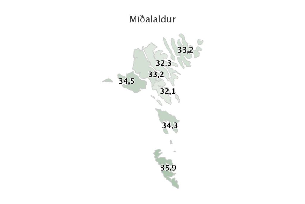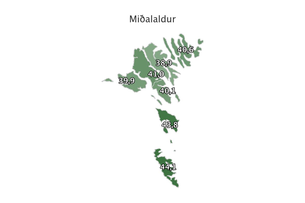 Miðalaldurin í Føroyum var 40,4 ár tann 1. januar 2026. Hægsti miðalaldurin á 44,1 ár var í Suðuroyar øki, meðan miðalaldurin var lægstur í Eysturoyar øki. Har eru fólk í miðal 38,9 ár.