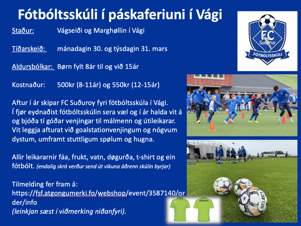 Leinkjan til tilmelding sæst her: https://www.atgongumerki.fo/3587140/fotboltsskulin-i-vagi
