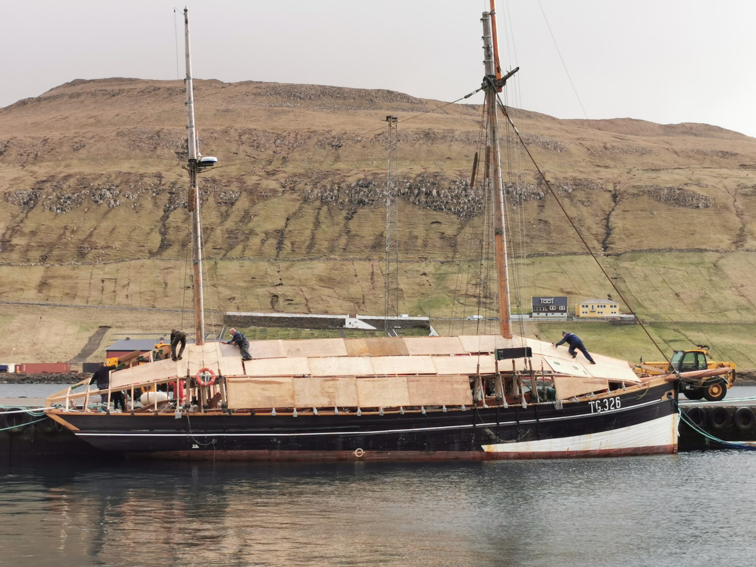 Í dag hava tey nógvu sjálvbodnu kring sluppina tikið presendingina av. Seint seinnapartin vóru pláturnar eftir at taka av.