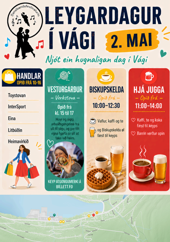 Leygardagin er Dansibands-leygardagur í Vági, har handlarnir hava longi opið, Vesturgarður skipar verkstovu, og Jugga og Biskupskelda hava eisini opið.