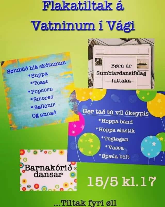 Ónsdagin 15. mai verður flakatiltak á Vatninum í Vági. Sí meiri um tiltakið niðanfyri. Facebook viðmerkingar Post navigation Nýggir ferðaleiðarar í Suðuroynni Træseglskipini farin avstað